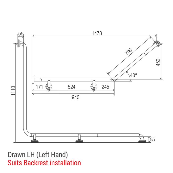 CF Corner Toilet Rail KG 1110x940x700mm - LH