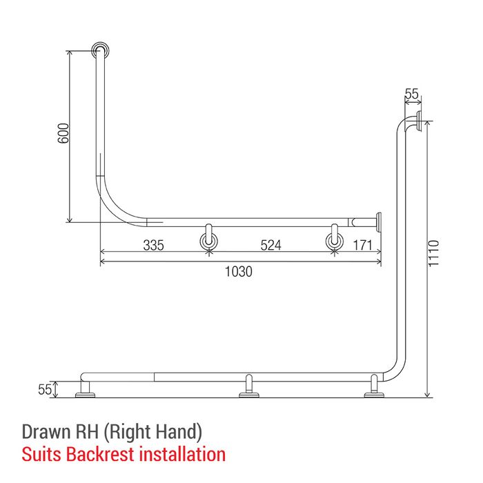 CF Corner Toilet Rail PS 1110x1030x600mm - RH
