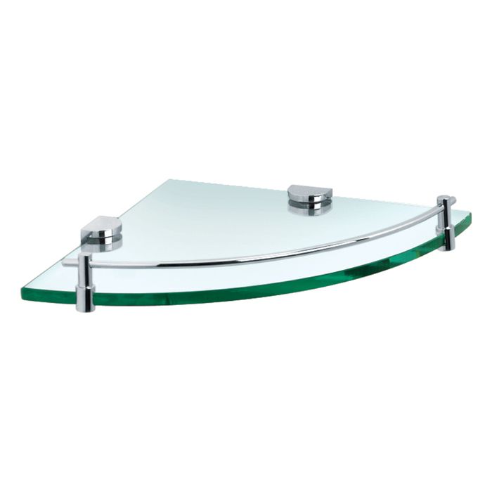 A versatile product, the glass corner shelf featuring a barrier can either be near a vanity or inside a shower recess.